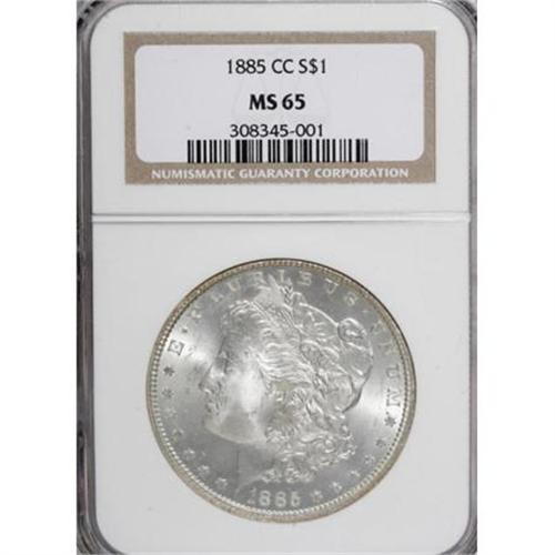 <B>1885-CC $1 MS65 NGC.</B></I> A lovely Gem exhibiting creamy, frosty luster and barely discernible light golden rim toning on each side. The surfaces are clear of most of the commonly seen, detracting abrasions that have come to haunt so many of these dollars.<BR><BR><B>Coin Engraver:</B> George T. Morgan<BR><BR><b>Shipping:</b> Coins & Currency (<a target="_blank" href="http://www.heritageauctions.com/common/shipping.php">view shipping information</a>)