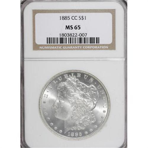 <B>1885-CC $1 MS65 NGC.</B></I> A sharply struck and splendidly lustrous Gem that has a nearly unabraded reverse and only a few faint grazes on the cheek and neck. The 1885-CC enjoys the status as the lowest mintage CC-mint Morgan dollar.<BR><BR><B>Coin Engraver:</B> George T. Morgan<BR><BR><b>Shipping:</b> Coins & Currency (<a target="_blank" href="http://www.heritageauctions.com/common/shipping.php">view shipping information</a>)