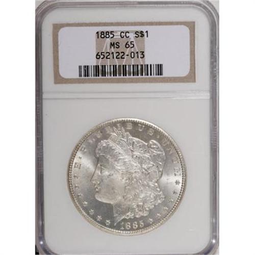 <B>1885-CC $1 MS65 NGC.</B></I> Sharply struck without any weakness over the centers, this Gem also displays semi-reflective fields and well preserved surfaces overall. A few traces of speckled tan patina keep the piece from being entirely brilliant, and some wispy contact marks are noted on Liberty's cheek. <BR><I>From The Oxford Collection.</B></I><BR><BR><B>Coin Engraver:</B> George T. Morgan<BR><BR><b>Shipping:</b> Coins & Currency (<a target="_blank" href="http://www.heritageauctions.com/common/shipping.php">view shipping information</a>)