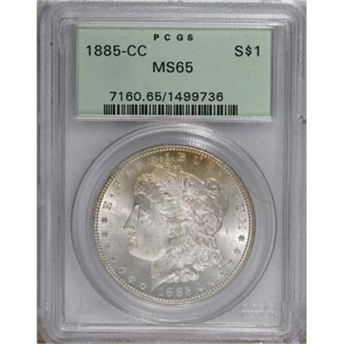 <B>1885-CC $1 MS65 PCGS.</B></I> PCGS Population (3215/817). NGC Census: (1433/440). Mintage: 228,000. Numismedia Wsl. Price for NGC/PCGS coin in MS65: $1,050. (#7160)<BR><BR><B>Coin Engraver:</B> George T. Morgan<BR><BR><b>Shipping:</b> Coins & Currency (<a target="_blank" href="http://www.heritageauctions.com/common/shipping.php">view shipping information</a>\)