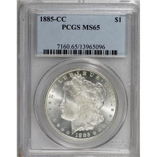 <B>1885-CC $1 MS65 PCGS.</B></I> The intense mint frost over each side of this dazzling Gem produces a high degree of eye appeal. The untoned surfaces show bright, reflective fields and snow-white devices. A beautiful Morgan dollar from the Carson City Mint. <BR><BR><B>Coin Engraver:</B> George T. Morgan<BR><BR><b>Shipping:</b> Coins & Currency (<a target="_blank" href="http://www.heritageauctions.com/common/shipping.php">view shipping information</a>)