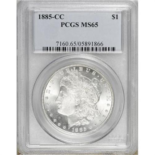 <B>1885-CC $1 MS65 PCGS.</B></I> An amazing Gem with excellent luster and brilliant mint frost. Like most CC Morgan dollars, examples are more plentiful in Mint State grades than in circulated grades.<BR><BR><B>Coin Engraver:</B> George T. Morgan<BR><BR><b>Shipping:</b> Coins & Currency (<a target="_blank" href="http://www.heritageauctions.com/common/shipping.php">view shipping information</a>)