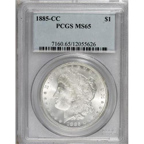 <B>1885-CC $1 MS65 PCGS.</B></I> PCGS Population (3321/843). NGC Census: (1442/457). Mintage: 228,000. Numismedia Wsl. Price for NGC/PCGS coin in MS65: $1,025. (#7160)<BR><BR><B>Coin Engraver:</B> George T. Morgan<BR><BR><b>Shipping:</b> Coins & Currency (<a target="_blank" href="http://www.heritageauctions.com/common/shipping.php">view shipping information</a>)