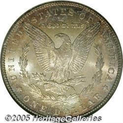 <B>1885-CC<img border='0' src='http://www.heritagecoins.com/images/star.gif' width=10 height=10>$1 MS66 NGC.</B></I> A moderately toned and mildly prooflike Gem that has outstanding eye appeal. Beautifully preserved, and with mild cameo contrast although not so designated on the NGC holder. A famously low mintage Carson City issue that appeared in quantity in the 1970s GSA sales.