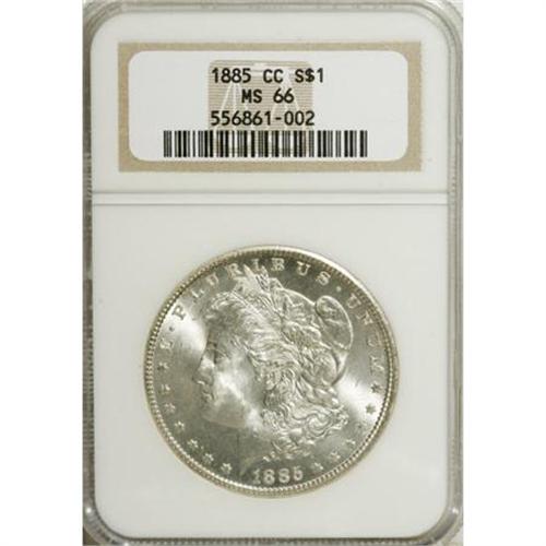 <B>1885-CC $1 MS66 NGC.</B></I> Despite a modest mintage of only 228,000 pieces, the 1885-CC dollar remains available in higher Mint State grades due to the storage of most examples in government vaults. Vibrant luster and a trace of reddish patina characterize this lovely, sharply struck Gem.<BR><I>From The Silver Fox Collection.</B></I><BR><BR><b>Shipping:</b> Coins & Currency (<a target="_blank" href="http://www.heritageauctions.com/common/shipping.php">view shipping information</a>)