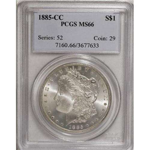 <B>1885-CC $1 MS66 PCGS.</B></I> Crisply struck with whispers of frost on the highpoints of the devices. Both sides offer powerful luster and slight hints of gold-inflected patina. PCGS has graded 37 coins finer (1/08).<BR><I>From The Jimmy G. PCGS Registry Collection of Morgan Dollars with Varieties.</B></I><BR><BR><B>Coin Engraver:</B> George T. Morgan<BR><BR><b>Shipping:</b> Coins & Currency (<a target="_blank" href="http://www.heritageauctions.com/common/shipping.php">view shipping information</a>)