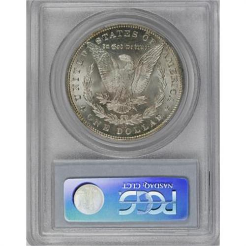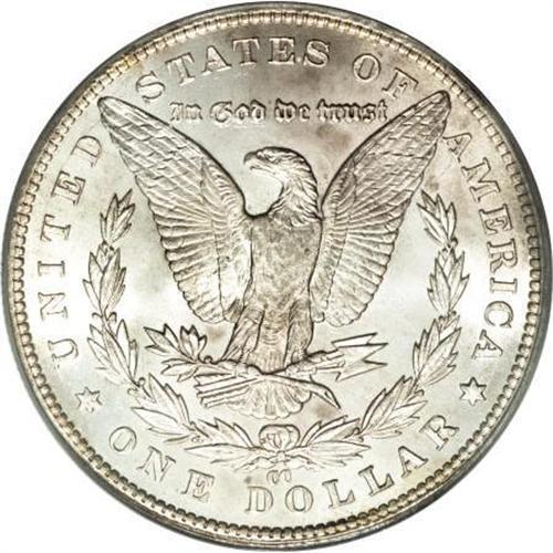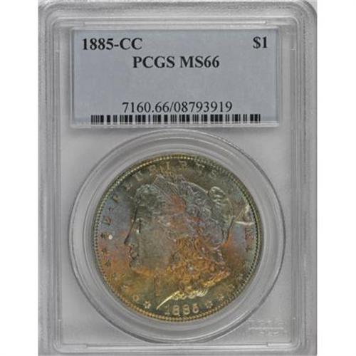 <B>1885-CC $1 MS66 PCGS.</B></I> The obverse exhibits a colorful display of vivid blue, lilac, rose, gold, and amber toning over frosty luster and sharp details. The reverse, also sharply defined with frosty silver luster, is entirely brilliant save for the slightest traces of heather. An impressive Premium Gem.<BR><BR><B>Coin Engraver:</B> George T. Morgan<BR><BR><b>Shipping:</b> Coins & Currency (<a target="_blank" href="http://www.heritageauctions.com/common/shipping.php">view shipping information</a>)