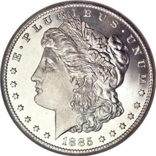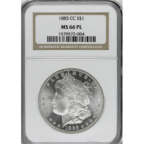 <B>1885-CC $1 MS66 Prooflike NGC.</B></I> Fortunate collectors of such high-grade issues as the present piece, even if they are too young to remember them, may attribute their existence to the General Services Administration releases of (mostly) CC dollars in the 1970s, where many thousands of 1885-CC dollars were sold--65% of the original mintage. The mega numbers of survivors notwithstanding, few indeed approach the state of preservation of the present lovely example. The surfaces are untoned and essentially distraction-free, but the mirrors are somewhat shallow, contrasting well against thickly frosted devices. Census: 21 in 66 Prooflike, 3 finer (1/08).<BR><BR><B>Coin Engraver:</B> George T. Morgan<BR><BR><b>Shipping:</b> Coins & Currency (<a target="_blank" href="http://www.heritageauctions.com/common/shipping.php">view shipping information</a>)