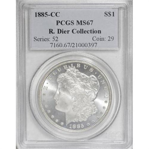 <B>1885-CC $1 MS67 PCGS.</B></I> Ex: R. Dier Collection. This virtually brilliant Superb Gem has flashy fields and potent luster. Sharply struck and well preserved with obvious eye appeal. The lowest mintage Carson City Morgan dollar, and in circulated condition, the rarest issue in the series, aside from the 1895. Population: 36 in 67, 1 finer (7/07).<BR><I>From The #3 PCGS 'Mile High' Registry Set of Carson City Morgan Dollars.</B></I><BR><BR><B>Coin Engraver:</B> George T. Morgan<BR><BR><b>Shipping:</b> Coins & Currency (<a target="_blank" href="http://www.heritageauctions.com/common/shipping.php">view shipping information</a>)
