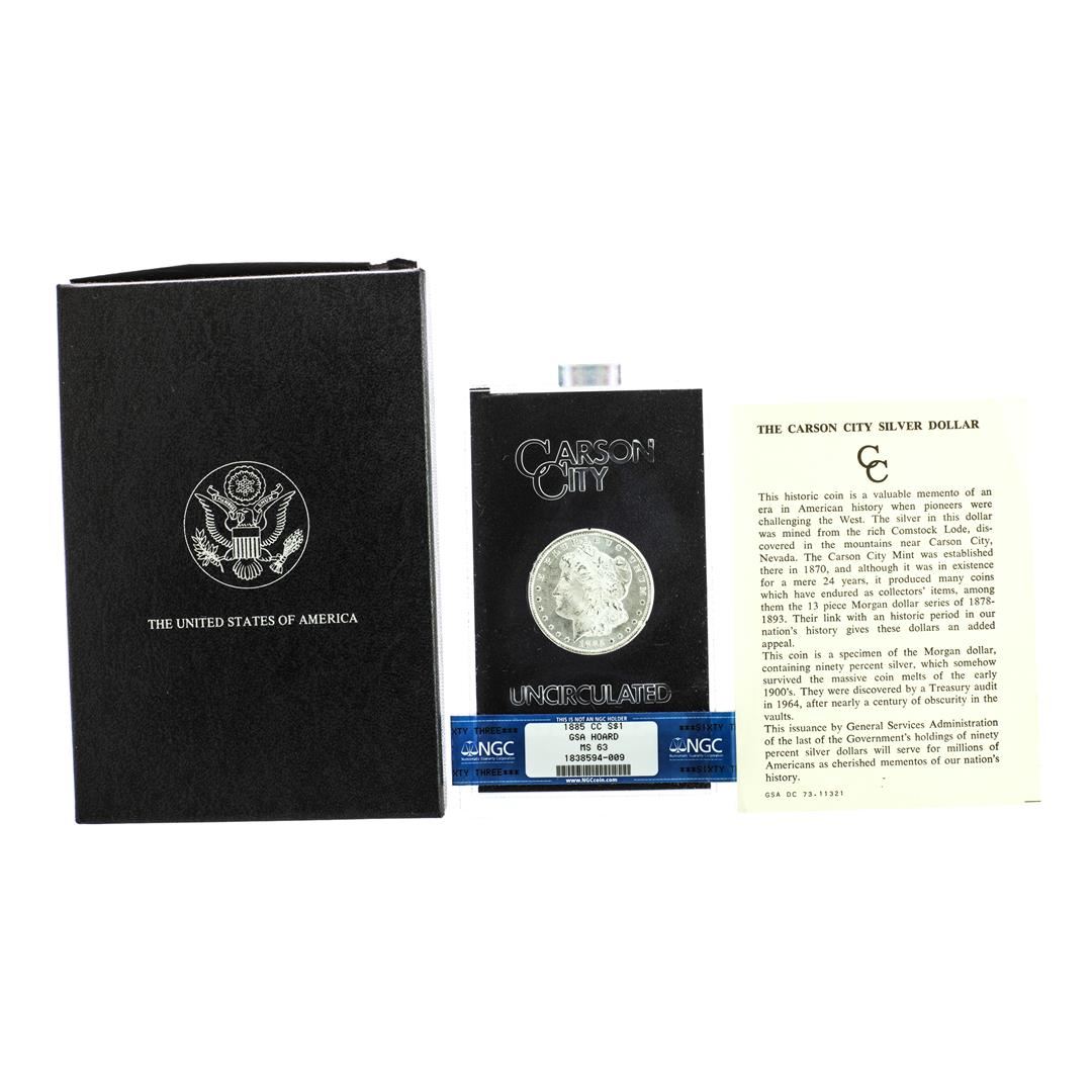 One 1885-CC $1 Morgan Silver Dollar Coin GSA Hoard Uncirculated w/Box & COA NGC MS63. NGC Certified.