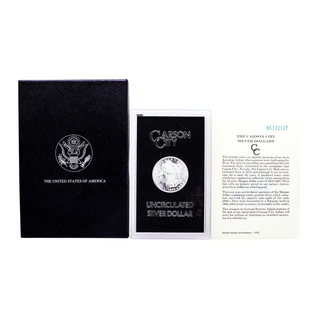 One 1885-CC $1 Morgan Silver Dollar Coin GSA Hoard Uncirculated w/Box & COA.