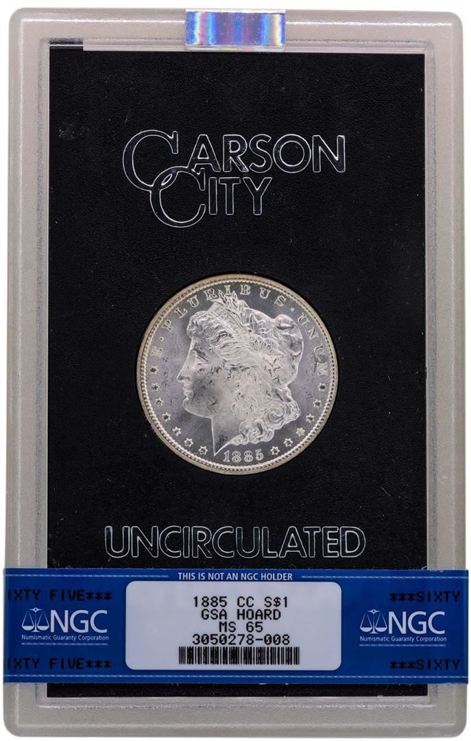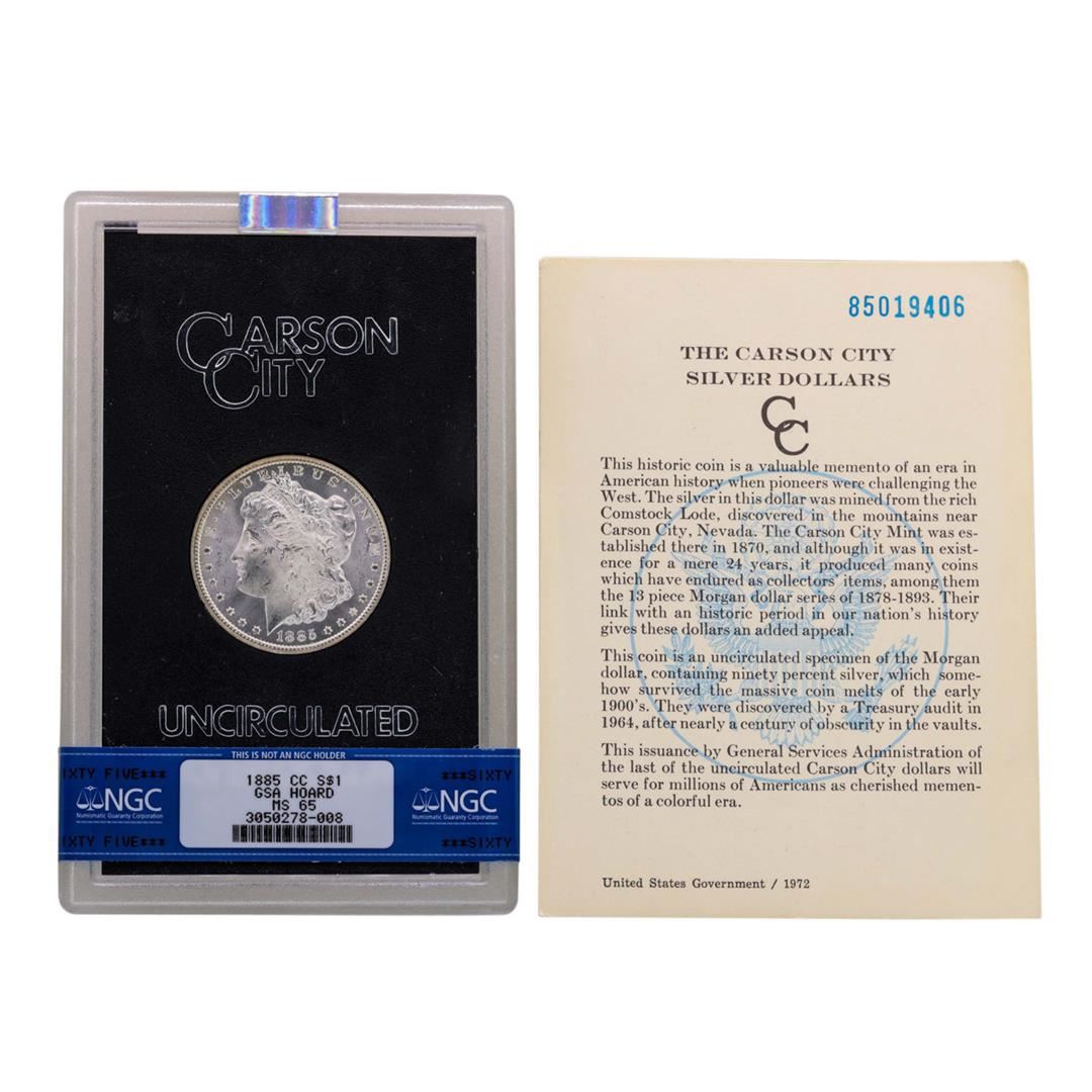 One 1885-CC $1 Morgan Silver Dollar Coin GSA NGC MS65 w/ COA. NGC Certified.