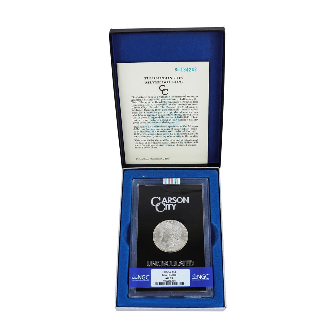 One 1885-CC $1 Morgan Silver Dollar Coin NGC MS63 GSA w/ Box & COA. NGC Certified.