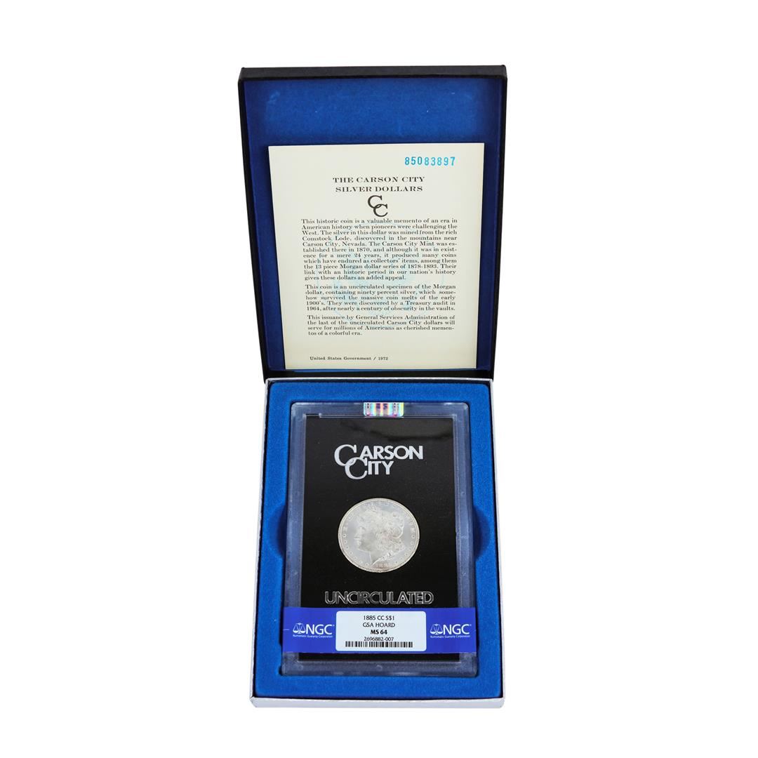 One 1885-CC $1 Morgan Silver Dollar Coin NGC MS64 GSA w/ Box & COA. NGC Certified.
