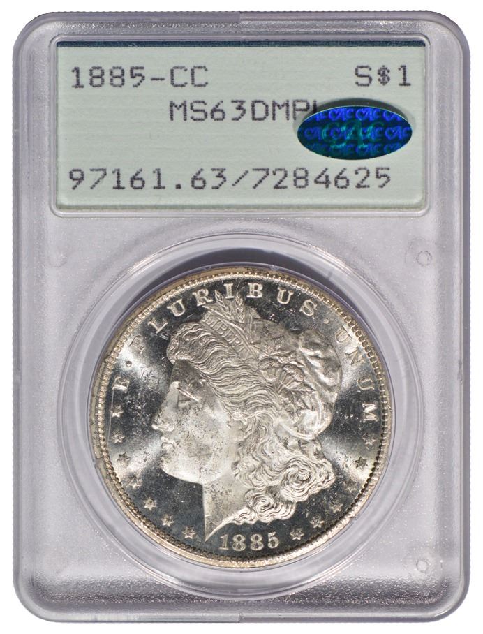 One 1885-CC $1 Morgan Silver Dollar Coin PCGS MS63DMPL CAC.