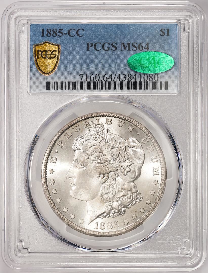 One 1885-CC $1 Morgan Silver Dollar Coin PCGS MS64 CAC. PCGS Graded.
