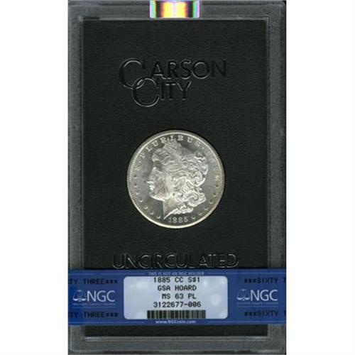 <B>1885-CC $1 MS63 Prooflike NGC.</B></I> The box and Certificate of Issue are included. NGC Census: (1085/2188). PCGS Population (0/0). (#407160)<BR><BR><B>Coin Engraver:</B> George T. Morgan<BR><BR><b>Shipping:</b> Coins & Currency (<a target="_blank" href="http://www.heritageauctions.com/common/shipping.php">view shipping information</a>)