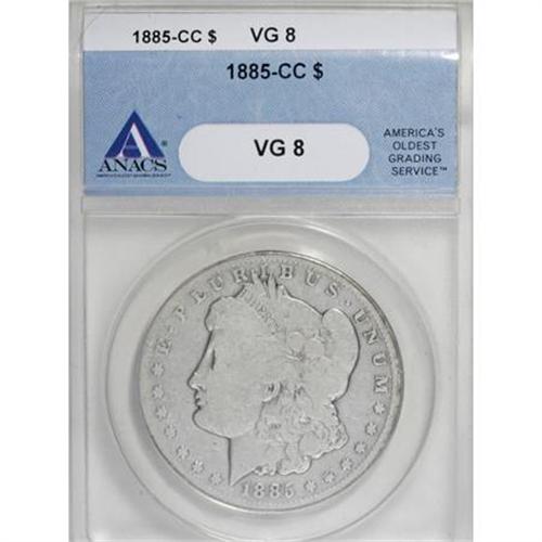 <B>1885-CC $1 VG8 ANACS.</B></I> . NGC Census: (0/6496). PCGS Population (8/15217). Mintage: 228,000. Numismedia Wsl. Price for NGC/PCGS coin in VG8 : $350. (#7160)<BR><BR><B>Coin Engraver:</B> George T. Morgan<BR><BR><b>Shipping:</b> Coins & Currency (<a target="_blank" href="http://www.heritageauctions.com/common/shipping.php">view shipping information</a>)