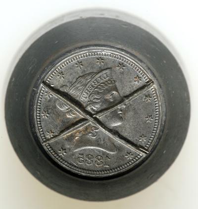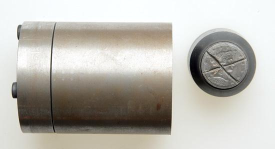 1885-CC. $10.00 Obverse Die. Canceled obverse die with "CC No. 2" stamped on the side. Includes 2 die splashes struck from this die; one in copper and one in white metal. Also includes a collar and a collum (made later) to hold the die. Note: No 1885-CC $10.00's were struck! A very unusual and unique item.