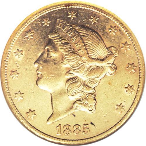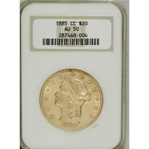 <B>1885-CC $20 AU50 NGC.</B></I> Carson City Mint Superintendent James Crawford died on March 8, 1885. Rather than suspend operations, the mint struck only silver dollars and double eagles during the year, both in limited numbers. The 1885-CC double eagle is scarce in all grades from the minuscule mintage of 9,450 business strikes, and it is quite elusive in Mint State. This example has canary-yellow surfaces, with moderate abrasions and a couple of obverse struck-in grease stains and some reverse alloy spots.<BR><BR><b>Shipping:</b> Coins & Currency (<a target="_blank" href="http://www.heritageauctions.com/common/shipping.php">view shipping information</a>)
