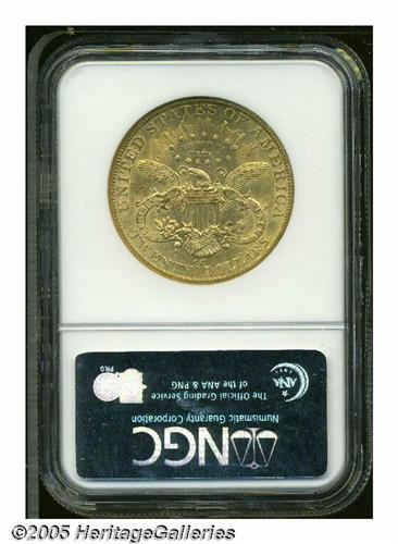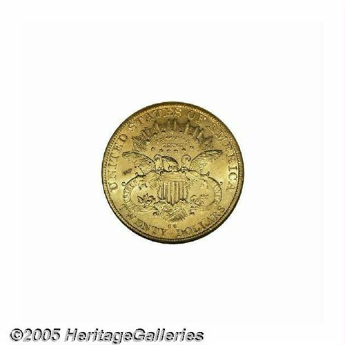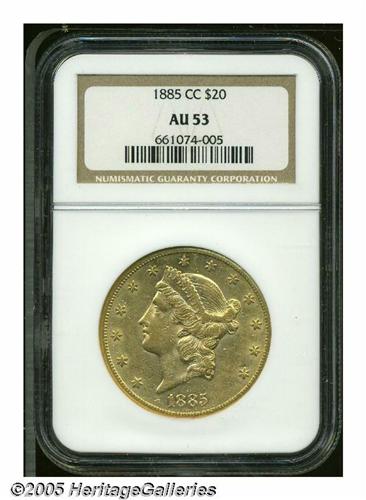 <B>1885-CC<$20> AU53 NGC.</B></I> Lustrous in the fields and fairly sharp. The surfaces show scattered handling marks from circulation. Identifiable by a drift mark in the planchet below the left wing of the eagle. With a paltry mintage of 9,450, all survivors are sought after and highly collectible.