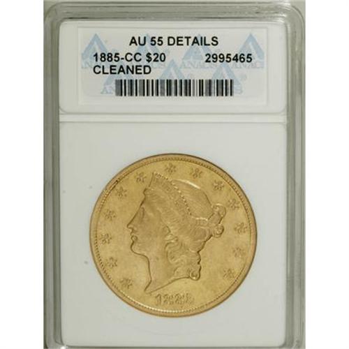 <B>1885-CC $20 --Cleaned--ANACS. AU55 Details.</B></I> With a mintage of just 9,450 pieces, the 1885-CC had a smaller production run than most Carson City double eagles. Though cleaning has disturbed this yellow-orange example's natural luster, the coin has a surprisingly pleasing appearance. Well-defined in the centers with only minor wear on the devices, though a few of the stars on the obverse display weakness.<BR><BR><B>Coin Engraver:</B> James B. Longacre<BR><BR><b>Shipping:</b> Coins & Currency (<a target="_blank" href="http://www.heritageauctions.com/common/shipping.php">view shipping information</a>\)