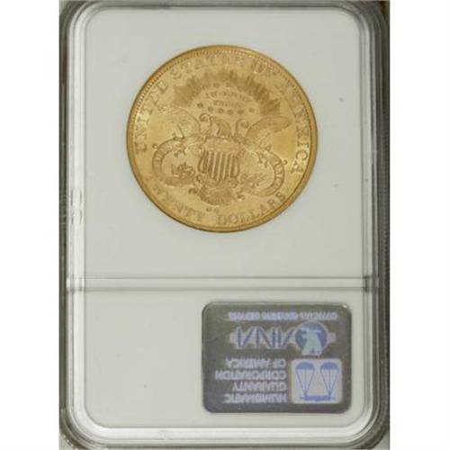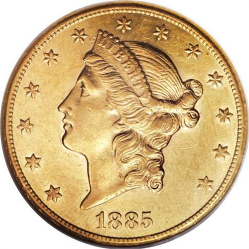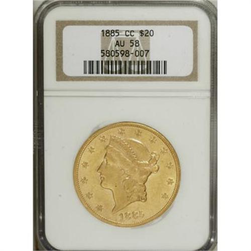 <B>1885-CC $20 AU58 NGC.</B></I> Due to the death of Mint Superintendent James Crawford on March 8, Carson City produced only silver dollars and double eagles, both with low mintages, before curtailing operations for the rest of 1885. The double eagle mintage was a mere 9,450 coins, and Rusty Goe, author of <I>The Mint on Carson Street, </B></I>estimates that only 40 to 50 pieces exist today in AU condition. <BR> For an AU coin, the typically numerous surface blemishes are unusually superficial, especially on the obverse. There are noticeable hairlines in the obverse fields, but the luster remains quite vigorous for the assigned grade. A conditionally scarce offering from an issue that becomes downright rare and prohibitively expensive in Mint State. Census: 53 in 58, 13 finer (6/07).<BR><BR><b>Shipping:</b> Coins & Currency (<a target="_blank" href="http://www.heritageauctions.com/common/shipping.php">view shipping information</a>)