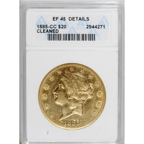 <B>1885-CC $20 --Cleaned--ANACS. XF45 Details.</B></I> One of only 9,450 pieces coined. This coin is typically struck and glossy with light wear overall. The bright straw-gold surfaces have assorted marks and a number of significant abrasions and scrapes on the portrait, as well as around the date.<BR><BR><b>Shipping:</b> Coins & Currency (<a target="_blank" href="http://www.heritageauctions.com/common/shipping.php">view shipping information</a>)
