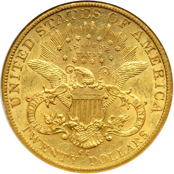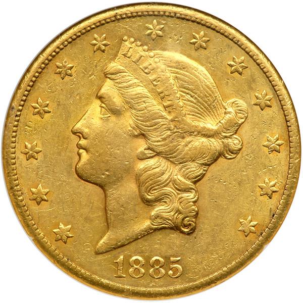 1885-CC $20 Liberty. NGC graded AU-55. Light uniform pale golden toning with luster around all the major devices and still adhering within Liberty's hair and throughout the eagle. The 85-CC is much scarcer than 82-CC thru 84-CC, as only 9,450 struck. Difficult to find this choice. Pop 45; 73 finer (PCGS # 9004) .