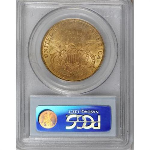 <B>1885-CC $20 MS62 PCGS.</B></I> The 1885-CC mintage figure of 9,450 pieces is considerably lower than for any other Carson City double eagles produced during the 1880s. Douglas Winter, in his <I>Gold Coins of the Carson City Mint</B></I>, says "It is the rarest Carson City double eagle from this decade, both in terms of overall and high grade rarity." Just about 40 Mint State examples have been certified by PCGS and NGC, with all but one in MS60 to MS62. That one is MS63.<BR> Apricot-gold surfaces show hints of light tan, and possess soft luster. A well executed strike sharpens the design elements, including those on the peripheries that are often weak. A few minute marks and luster grazes are scattered about, much less so than typically seen on this heavily abraded date. Population: 12 in 62, 1 finer (8/07).<BR><BR><B>Coin Engraver:</B> James B. Longacre<BR><BR><b>Shipping:</b> Coins & Currency (<a target="_blank" href="http://www.heritageauctions.com/common/shipping.php">view shipping information</a>)