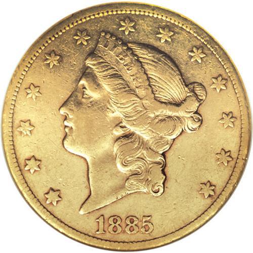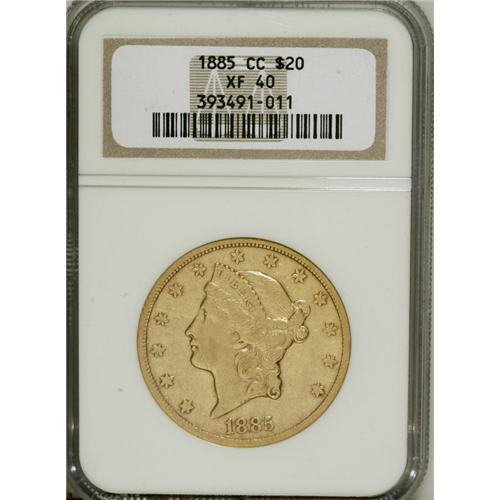 <B>1885-CC $20 XF40 NGC.</B></I> Douglas Winter (2001) contends that the 1885-CC twenty dollar, with a mintage of 9,450 pieces, is the rarest Carson City double eagle from the 1880s, both in terms of overall and high-grade rarity. Yellow-gold surfaces display somewhat prooflike fields that yield pleasing contrast with the devices, especially when the coin is tilted under a light source. Better-than-average definition occurs on the design features, though the first couple of stars reveal the usual softness. With respect to abrasions, Winter writes that "Nearly every known 1885-CC double eagle shows excessive bagmarks on the surfaces." The marks occurring on the present example are certainly not "excessive" for the grade, nor are any worthy of special mention.<BR><BR><b>Shipping:</b> Coins & Currency (<a target="_blank" href="http://www.heritageauctions.com/common/shipping.php">view shipping information</a>)