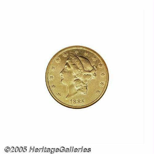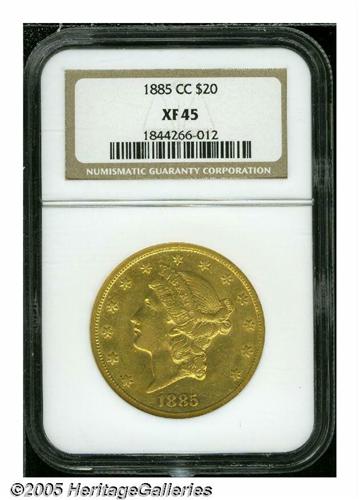 <B>1885-CC<$20> XF45 NGC.</B></I> A desirable Carson City issue, one of a scant 9,450 pieces struck. The lustrous surfaces exhibit much reddish color on each side, and there are few substantive marks. Lightly worn on each of the two sides, for the assigned grade level.