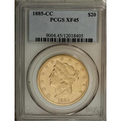 <B>1885-CC $20 XF45 PCGS.</B></I> An extremely bright and cheerful example of this consistently popular Carson City issue. The rarest CC-mint Double Eagle from the 1880s, the 1885-CC was produced to the extent of just 9,450 pieces. Most pieces entered circulation at the time of issue, and even the example in the Smithsonian Institution grades XF45, placing the presently offered example in very good company. Some light scratches are seen in the fields, not inconsistent for the grade.<BR><I>From The York/Hallenbeck #2 Current Finest PCGS Registry Set of Liberty Double Eagles.</B></I><BR><BR><B>Coin Engraver:</B> James B. Longacre<BR><BR><b>Shipping:</b> Coins & Currency (<a target="_blank" href="http://www.heritageauctions.com/common/shipping.php">view shipping information</a>)