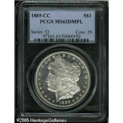 <B>1885-CC<img border='0' src='http://www.heritagecoins.com/images/star.gif' width=10 height=10>$1 MS63 Deep Mirror Prooflike PCGS.</B></I> A brilliant and splendidly mirrored Silver Dollar, well struck as is usual for this low mintage issue. The cheek and left obverse field display luster grazes, while the reverse is well preserved. Lot:10204