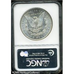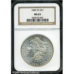 <B>1885-CC<img border='0' src='http://www.heritagecoins.com/images/star.gif' width=10 height=10>$1 MS63 NGC.</B></I> Crisply detailed and essentially untoned, with thick mint frost over obverse and reverse alike. Minor overall scuffiness, along with some milky spots on both sides, limit the assigned grade. Lot:10187