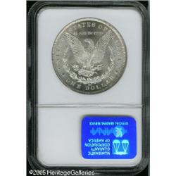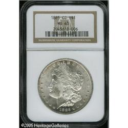 <B>1885-CC<img border='0' src='http://www.heritagecoins.com/images/star.gif' width=10 height=10>$1  MS63 NGC.</B></I> Well struck with bright, frosty, essentially brilliant surfaces that display a tiny bit of russet color near the left obverse border, and a couple of moderate marks on Liberty's cheek that prevent a slightly higher grade assignment from NGC.    Lot:10184