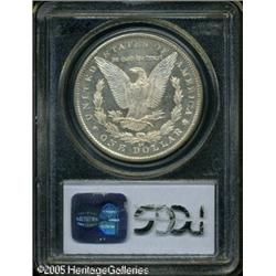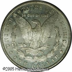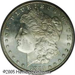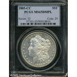 <B>1885-CC<img border='0' src='http://www.heritagecoins.com/images/star.gif' width=10 height=10>$1 MS65 Deep Mirror Prooflike PCGS.</B></I> While frequently available in the lower grades of Uncirculated and with strong contrast, the 1885-CC is not at all common in Gem condition and with DMPL fields. This is a fully struck example that shows chalk-white devices against deeply mirrored fields. While an untoned coin, the obverse especially shows considerable haziness. Population: 197 in 65, 51 finer (1/05). Lot:10205