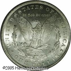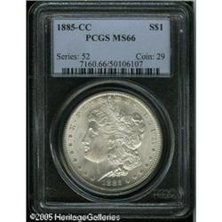 <B>1885-CC<img border='0' src='http://www.heritagecoins.com/images/star.gif' width=10 height=10>$1 MS66 PCGS.</B></I> An untoned representative of this important and widely collected Carson City dollar. The low mintage is certainly a pull for dollar collectors, and coupled with its widespread availability in mint condition, the 1885-CC is a very appealing issue for collectors. This is a brilliant coin with the usual superb mint frost. Sharply struck, there are no detracting blemishes on this high grade example. Lot:10202