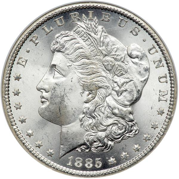 1885-CC Morgan Dollar. NGC graded MS-65. Blast white surfaces whose luster skips and dances over the coin in that wonderful way CC-mint Dollars do. A real charmer; a solid Gem BU (PCGS # 7160) .