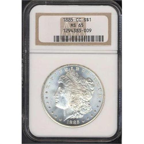 <b>1885-CC Morgan Dollar. NGC graded MS65.</b> Likely an early strike from fresh dies, judging from the details. The surfaces are satin silver and as bright as a full-moon night in the countryside. Regarding this date, the clearest details are found throughout the peripheral areas and also encompassing the key centers which are crystal clear as well. A very handsome '85-CC silver dollar. One of only 228,000 minted <b>(PCGS # 7160)</b>
