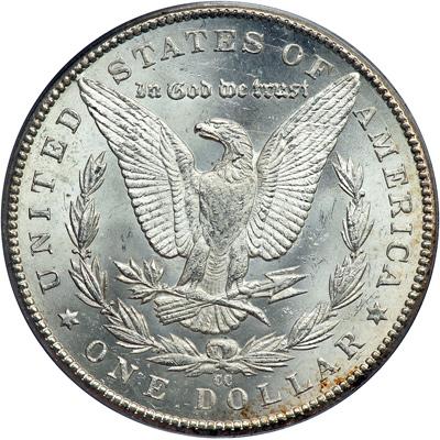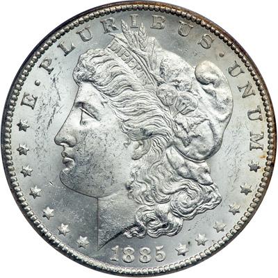 1885-CC Morgan Dollar. PCGS graded MS-63. Bright white radiance glances off the surface of this handsome piece like lightning (PCGS # 7160) .