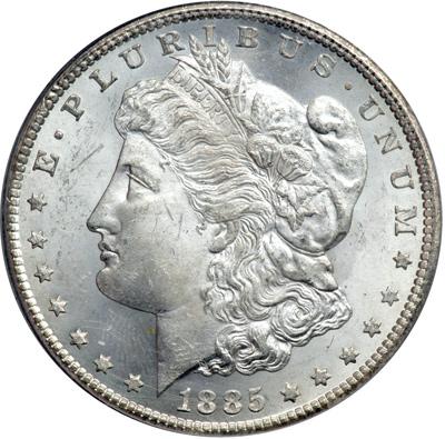 1885-CC Morgan Dollar. PCGS graded MS-64. A hint of light tone, the surface agreeably frosty (PCGS # 7160) .