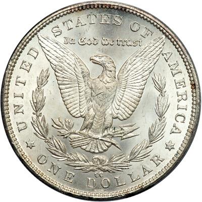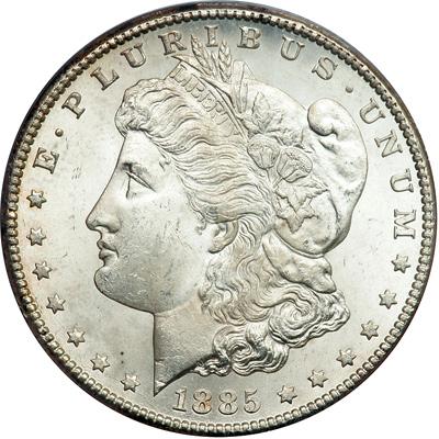 1885-CC Morgan Dollar. PCGS graded MS-64. Primarily untoned and quite frosty. Lovely lustrous fields. No deviation in the sharp relief seen, not even in the centers of the coin, including the eagle's breast detail, which is clearly defined. There is, however, a small mark on the breast (PCGS # 7160) .