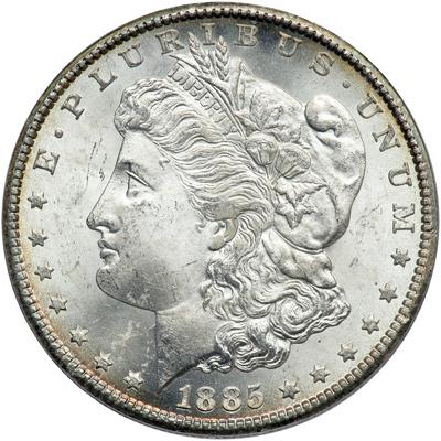 1885-CC Morgan Dollar. PCGS graded MS-64. Nice reverse toning, a wonderful flux of silvery luster dances atop the surface on both sides (PCGS # 7160) .