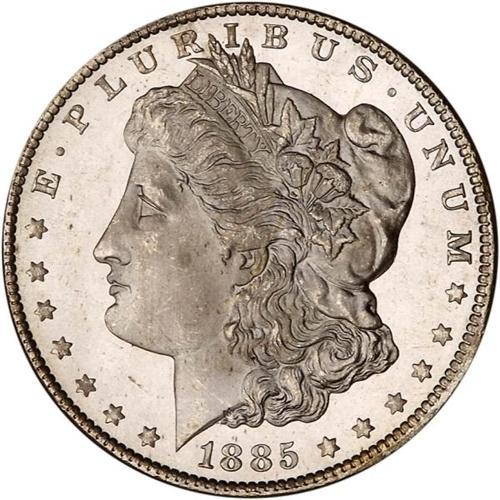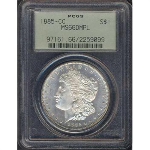 <b>1885-CC Morgan Dollar. PCGS graded MS66 DMPL.</b> An appealing fresh silvery white specimen, fully struck, and unmarred by discoloration or contact marks. Quite difficult to encounter in this nice a "deep mirror" prooflike grade showing full mint bloom on the contrasting devices. Struck with mathematical precision by the dies. Only 228,000 minted of the 1885-CC Morgan <b>(PCGS # 97161)</b>