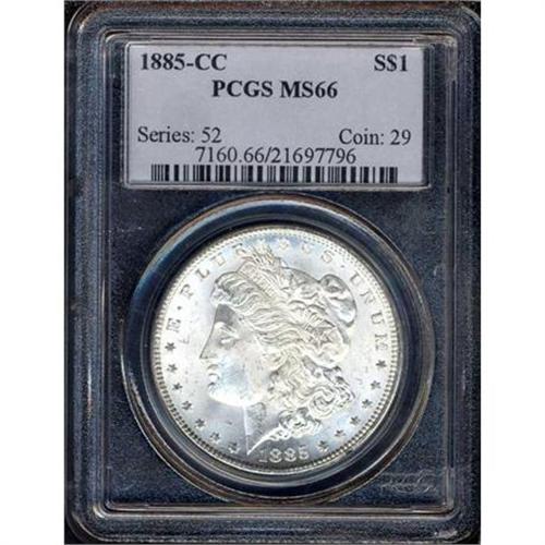 <b>1885-CC Morgan Dollar. PCGS graded MS66.</b> The surfaces glisten with headlight bright silvery color that will make your head spin <b>(PCGS # 7160)</b> <i>