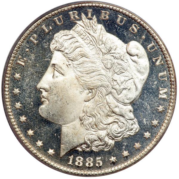 1885-CC Morgan Dollar. PCGS graded MS-65 Deep Mirror Prooflike. CAC Approved. A nice fully white coin whose mirrors are deep, reflective, and watery as they provide a foundation for the frosted lift of the design features. Pop 206; 42 finer (PCGS # 97161) .