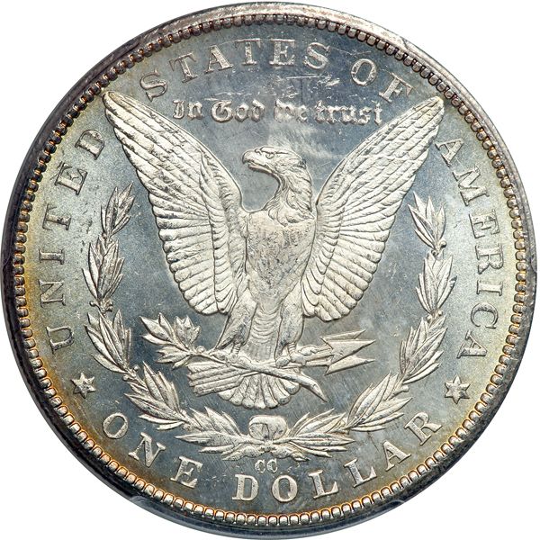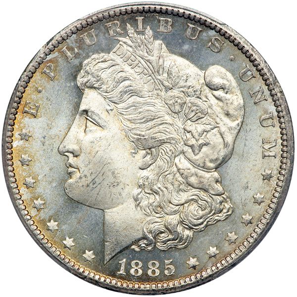 1885-CC Morgan Dollar. PCGS graded MS-66. Nice semi-prooflike surfaces. A hint of light gold tone. Lustrous surfaces are a hallmark of Mint State ?85-CC silver dollars, but some, usually the first strikes from new dies, display reflective qualities as well rather than a more frosty look. Ideal in every way is the bold strike. A truly beautiful gem specimen of a popular CC branch mint issue from our silver mining district of Nevada (PCGS # 7160) .