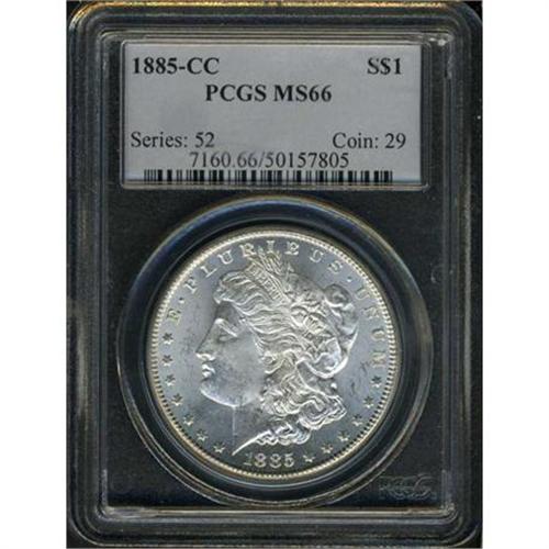 <b>1885-CC Morgan Dollar. PCGS graded MS66.</b> Swirling frosty surfaces, with bright silver color bursting as when first struck. The devices are matte and typical for 1885-CC while the color is bold, with no toning. New CC-dollars are difficult to find this nice <b>(PCGS # 7160)</b>