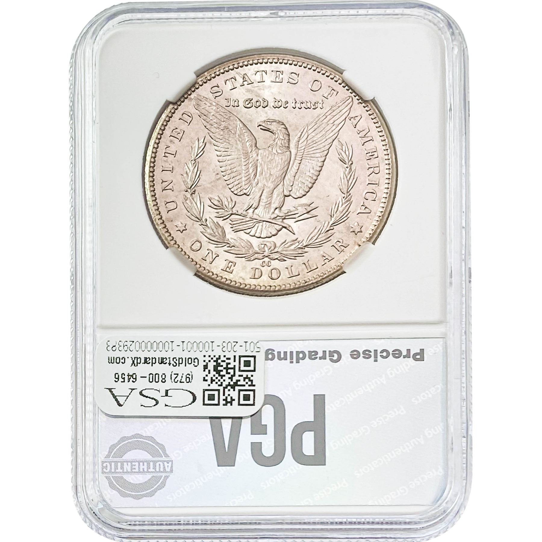 COINS AND CURRENCY LISTED IN GSA’S CATALOG AS GRADED AND ENCAPSULATED BY PCGS, NGC, ANACS, ICG, PCGS CURRENCY, PMG, PCGS BANKNOTE GRADING, CMC OR ANY OTHER THIRD-PARTY GRADING SERVICE ARE LIKEWISE SOLD “AS-IS” EXCEPT AS EXPRESSLY SET FORTH HEREIN. ALL THIRD-PARTY GRADING SERVICE GUARANTEES, INCLUDING AUTHENTICITY, ARE THE SOLE RESPONSIBILITY OF THE THIRD-PARTY GRADING SERVICE AND NOT WARRANTIES OR GUARANTEES OF GSA. BIDDERS SHOULD CONTACT THESE THIRD-PARTY GRADING SERVICES DIRECTLY WITH RESPECT TO ANY CLAIMS OR QUESTIONS THEY MAY HAVE CONCERNING THEIR GUARANTEES AND WARRANTIES. BIDDERS ACKNOWLEDGE AND AGREE THAT AUCTIONEER IS NOT BOUND BY OR LIABLE FOR ANY OPINION OR CERTIFICATION BY ANY THIRD-PARTY GRADING SERVICE. REMOVAL OF A PRODUCT FROM ITS PROTECTIVE CASING OR HOLDER OR ALTERATION OF ANY COIN HOLDER WAIVES ALL RIGHTS CONCERNING THE PRODUCT CONTAINED THEREIN.